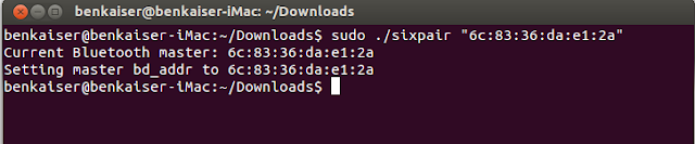 6. Sixpair by default when run changes the bluetooth address to be the computer's bluetooth address. This is not what we want, we want it to be the phone's (or tablet's) Bluetooth address. To do this we need to pass the address as a parameter to the program as follows (remember to have the device plugged in over usb before running the following command):